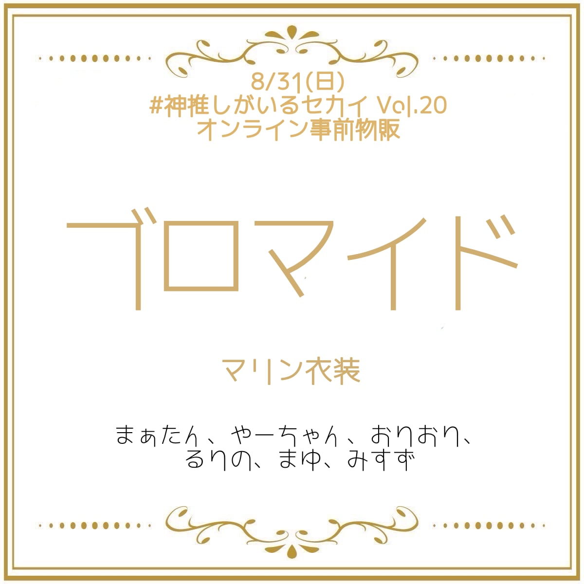 8/31(日)に出演を予定している「#神推しがいるセカイ Vol.20」で着用する、マリン衣装のブロマイド3点セットです。事前予約限定販売のためイベント前日までの受付となります。
