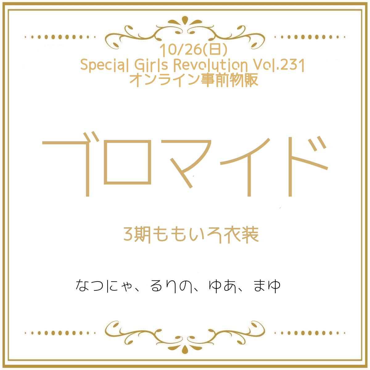 10/26(日)に出演を予定している「Special Girls Revolution Vol.231」で着用する、プリンセス風衣装のブロマイド3点セットです。事前予約限定販売のためイベント前日までの受付となります。