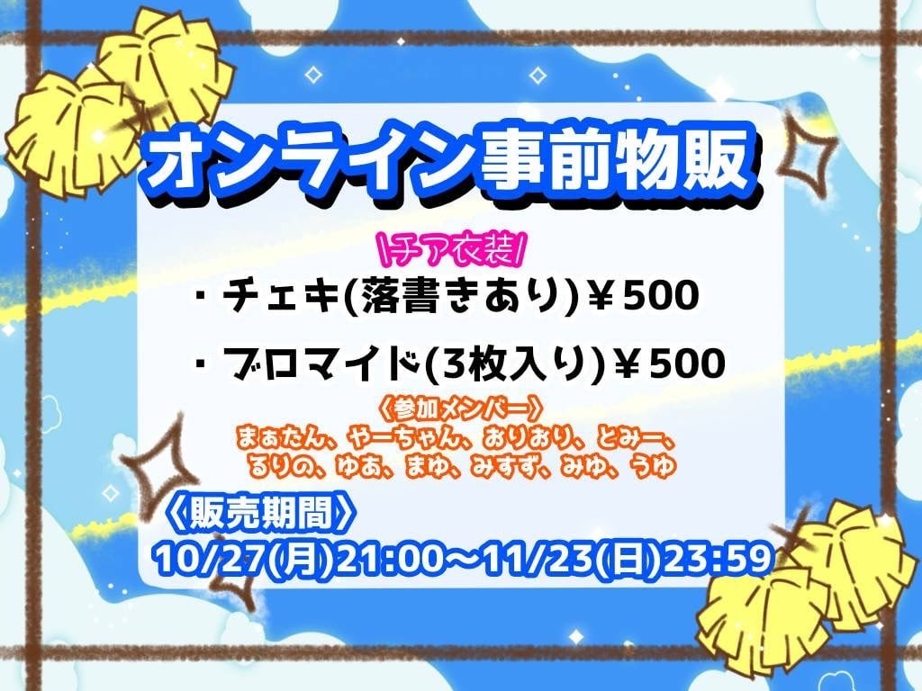 11/24(月・祝)に出演を予定している「Super Rising Emotions Vol.3」で着用する、チア衣装のブロマイド3点セットです。事前予約限定販売のためイベント前日までの受付となります。