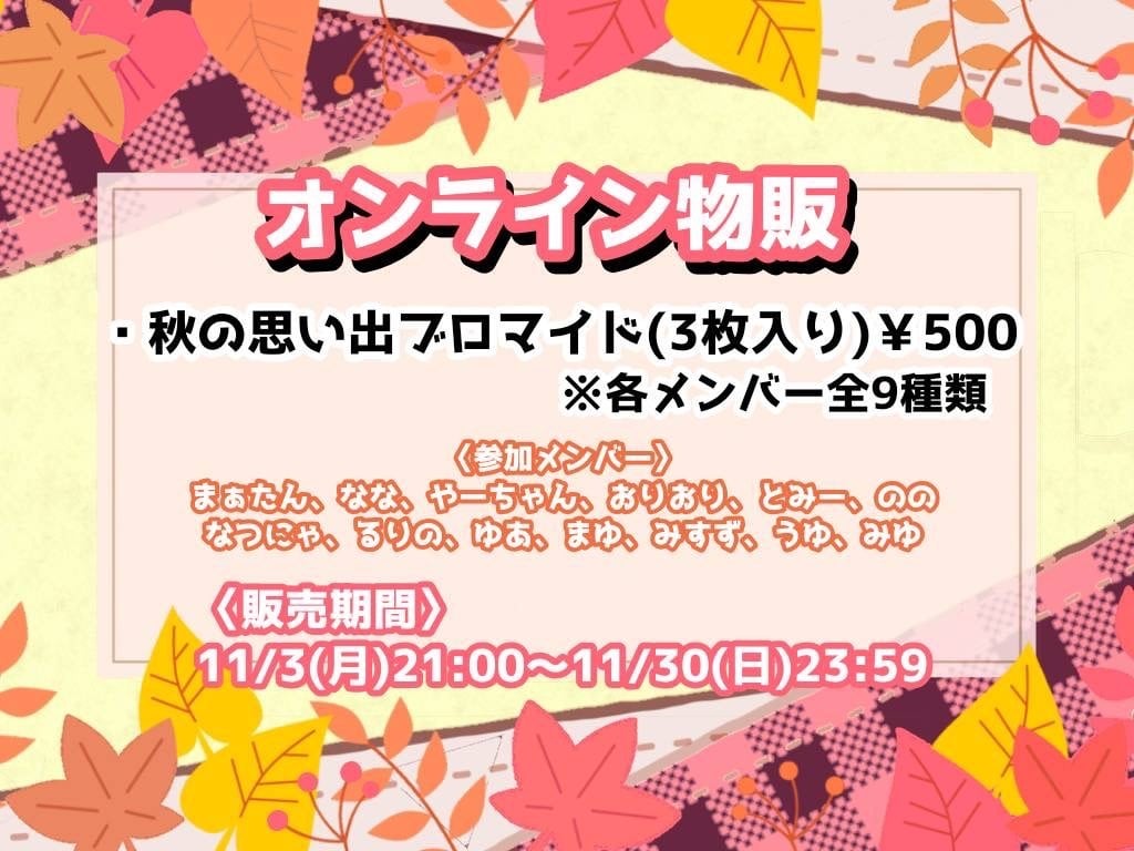 メンバー各自の秋の思い出を切り抜いたブロマイドです。普段は見られないメンバーの姿をお楽しみにしてください!