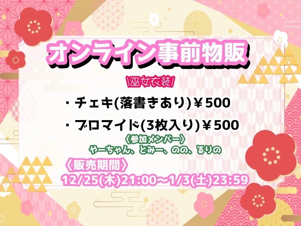 1/4(日)に出演を予定している「UNISTAGE」で着用する、巫女衣装のブロマイド3点セットです。事前予約限定販売のためイベント前日までの受付となります。